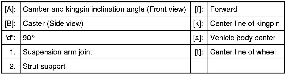 Camber, caster and kingpin inclination angle are not adjustable. If they are out of specification, check vehicle body or replace related part.