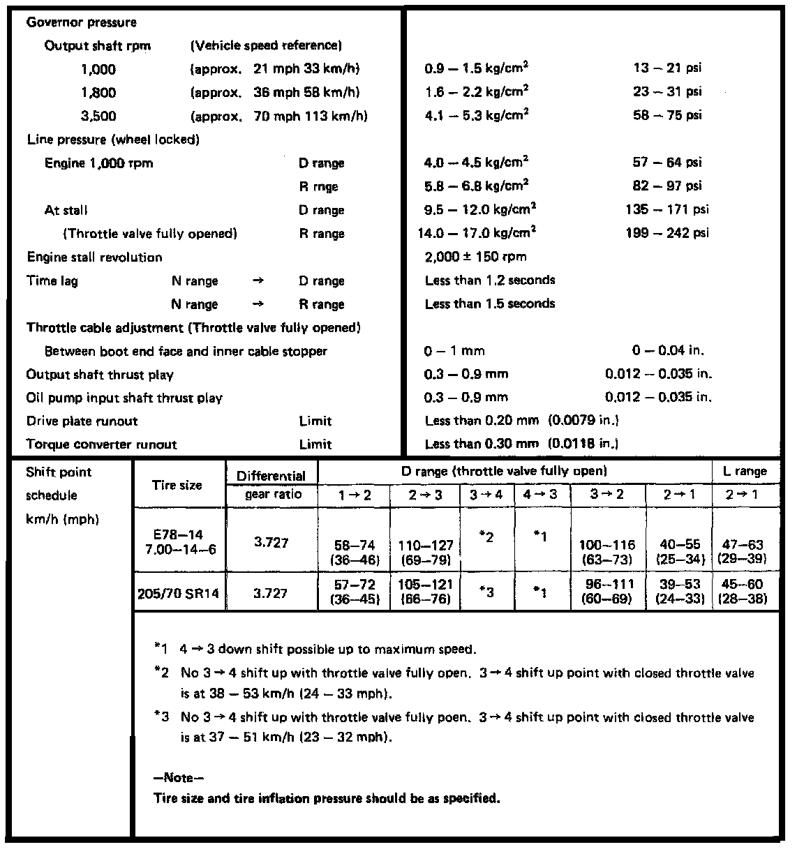 A43D 4-spd A/T, Governor Pressure/Shift Points: