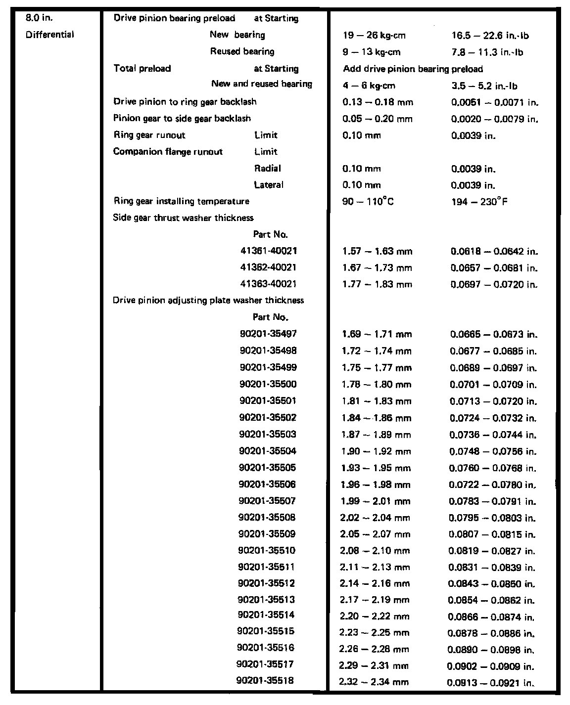 8.0 Inch Differential, Pinion Preload/Thickness: