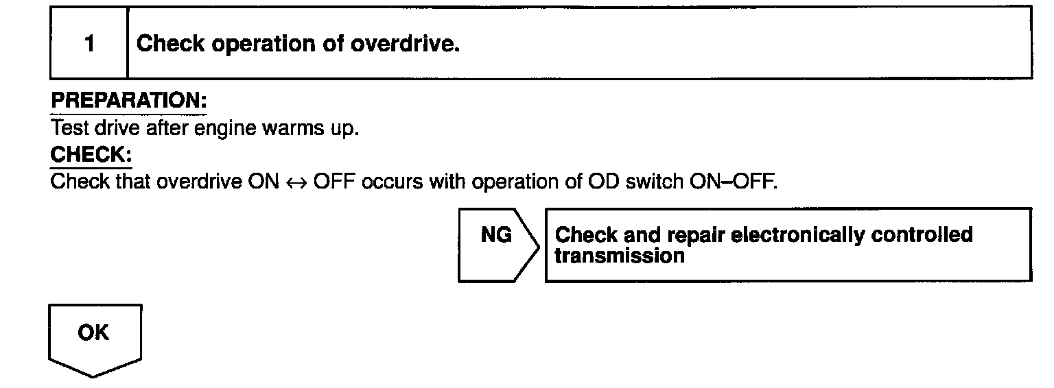 CIRCUIT DESCRIPTIONWhen driving uphill under the cruise control, in order to reduce shifting due to ON-OFF overdrive operation and to provide smooth driving, when down shifting in the electronically controlled transmission occurs, a signal to prevent upshift until the end of the up hill slope is sent from the cruise control ECU to the electronically controlled transmission.