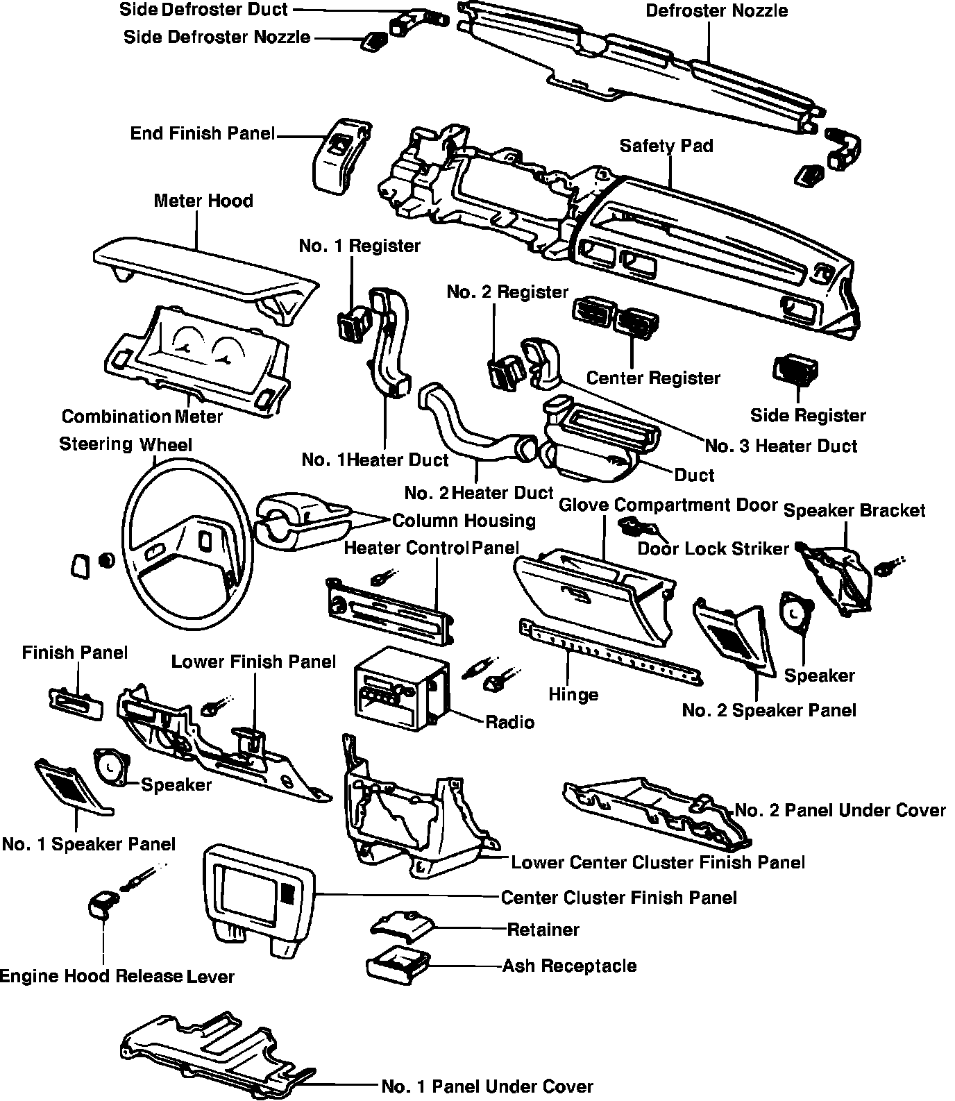 9. On front wheel drive models, remove No. 1 heater duct, end finish panel and No. 2 panel under cover.