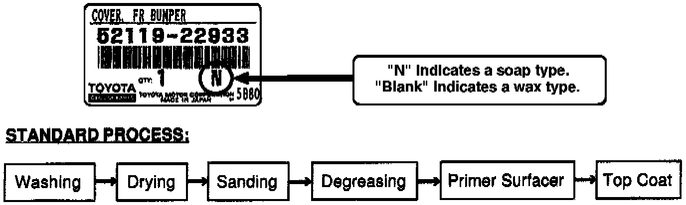 Recently, the mold lubricant (release agent) was changed from a wax type to a soap type on OEM supply parts. The wax lubricant was discontinued because wax removal from the bumper surface required the use of trichloroethane.