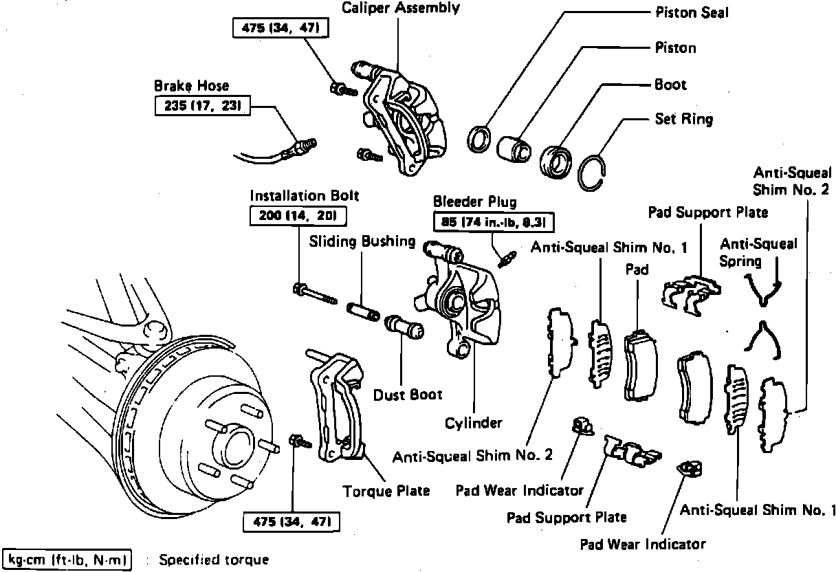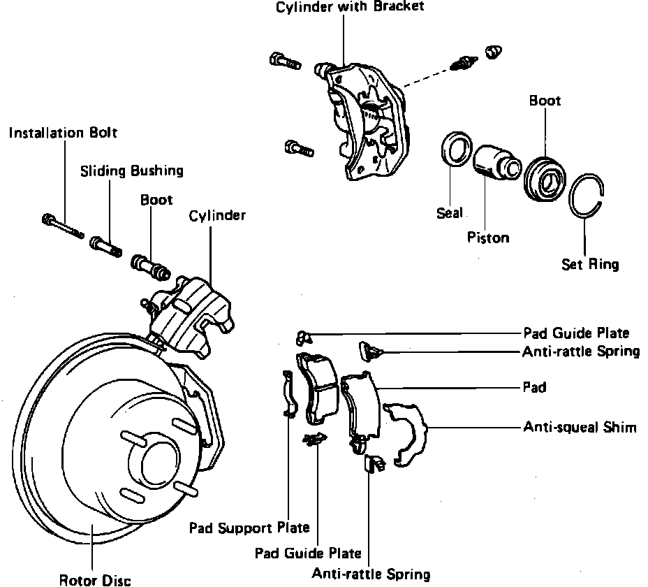 For additional information see Removal and Installation Notes. Service NotesFig. 1 Exploded View Of Rear Disc Brake Caliper Assembly. Supra & Celica: