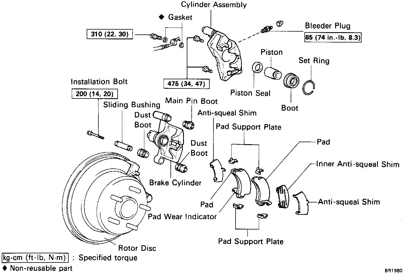 - Check the pad thickness through the cylinder inspection hole and replace pads if not within specification.