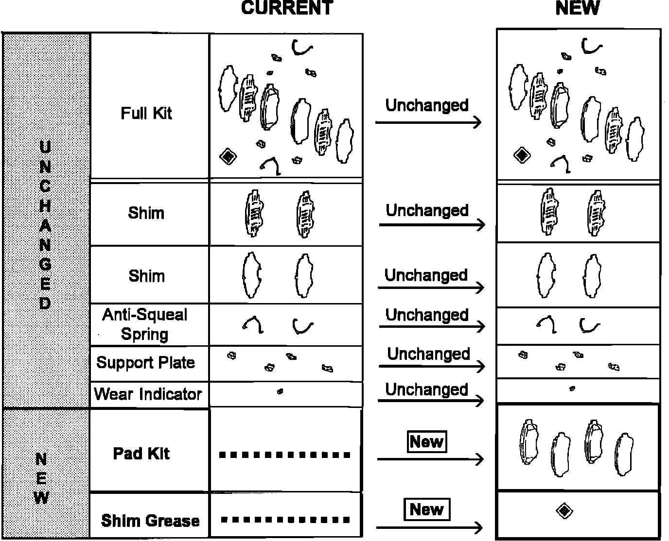 1) All vehicles are to be inspected to insure that the integrity of the complete brake system is maintained. When replacing worn pads, you should replace the shims, wear indicators, (wear indicators may be riveted onto pads for some models) and shim grease at the same time. Vehicles found to need extensive hardware replacement, including anti-squeal springs and support plates, should be repaired using the full pad kit which includes all hardware components.