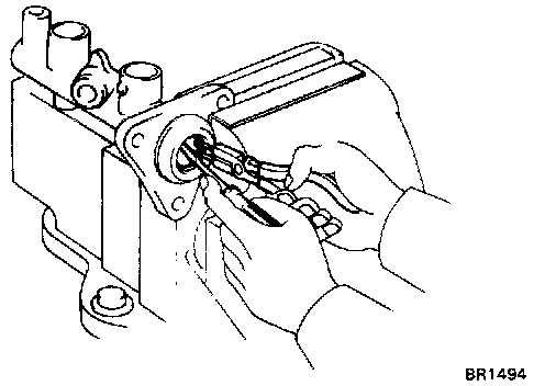 - Push in the piston with a screwdriver and remove the snap ring with snap ring pliers.