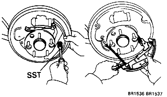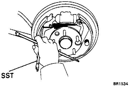 Using SST #09718-00010 remove the shoe hold-down spring, cups and pin.