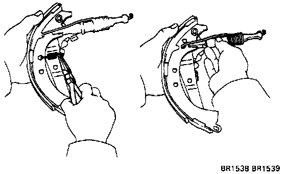 Using pliers, disconnect the parking brake cable from. the lever and remove the rear shoe together with the adjuster.