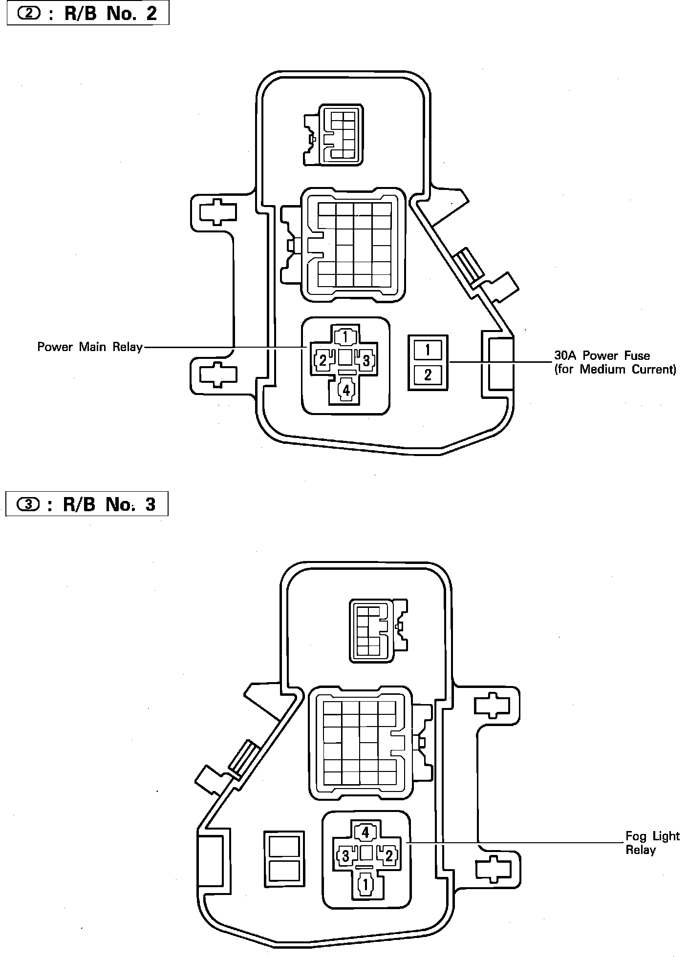 Fuse Panel: Relay Boxes No. 2 (Left Kick Panel) And No. 3 (Right Kick Panel):