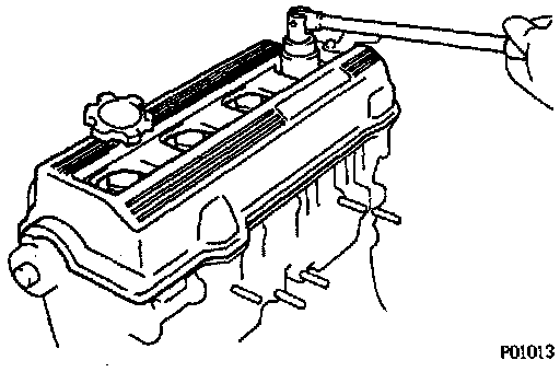 ^ If the camshaft is not being lifted out straight and level, retighten the two No.3 bearing cap bolts. Then reverse the order of above steps from (f) to (a) and reset the knock pin of the intake camshaft at 10-45° BTDC, and repeat steps from (b) to (f) once again.