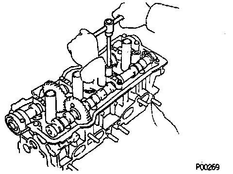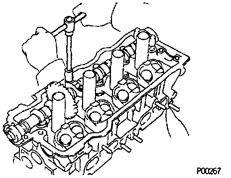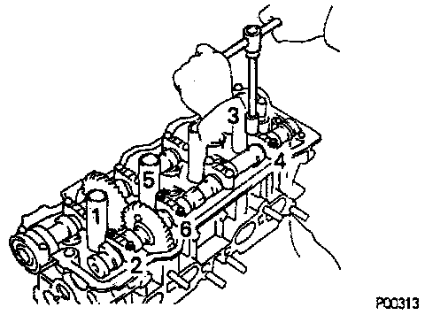 CAUTION: Since the thrust clearance of the camshaft is small, the camshaft must be kept level while it is being removed. If the camshaft is not kept level, the portion of the cylinder head receiving the shaft thrust may crack or be damaged, causing the camshaft to seize or break. To avoid this, the following steps should be carried out.