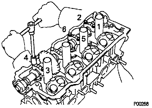 c. Uniformly loosen and remove the six bolts on the No. 1, No.3 and No.4 bearing caps in several passes in the sequence shown.
