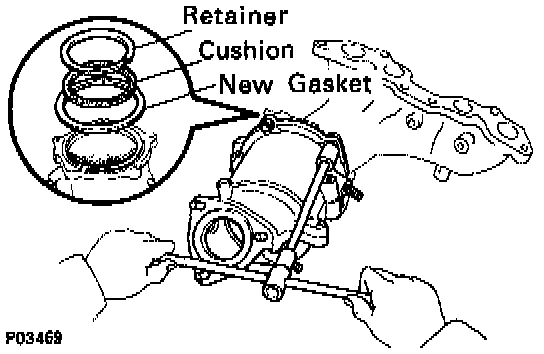 a. Place the cushion, retainer and a new gasket on the catalytic converter.