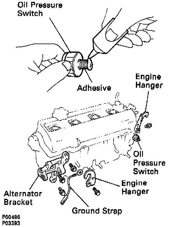 9. Install oil pressure switch, apply adhesive to two or three threads.