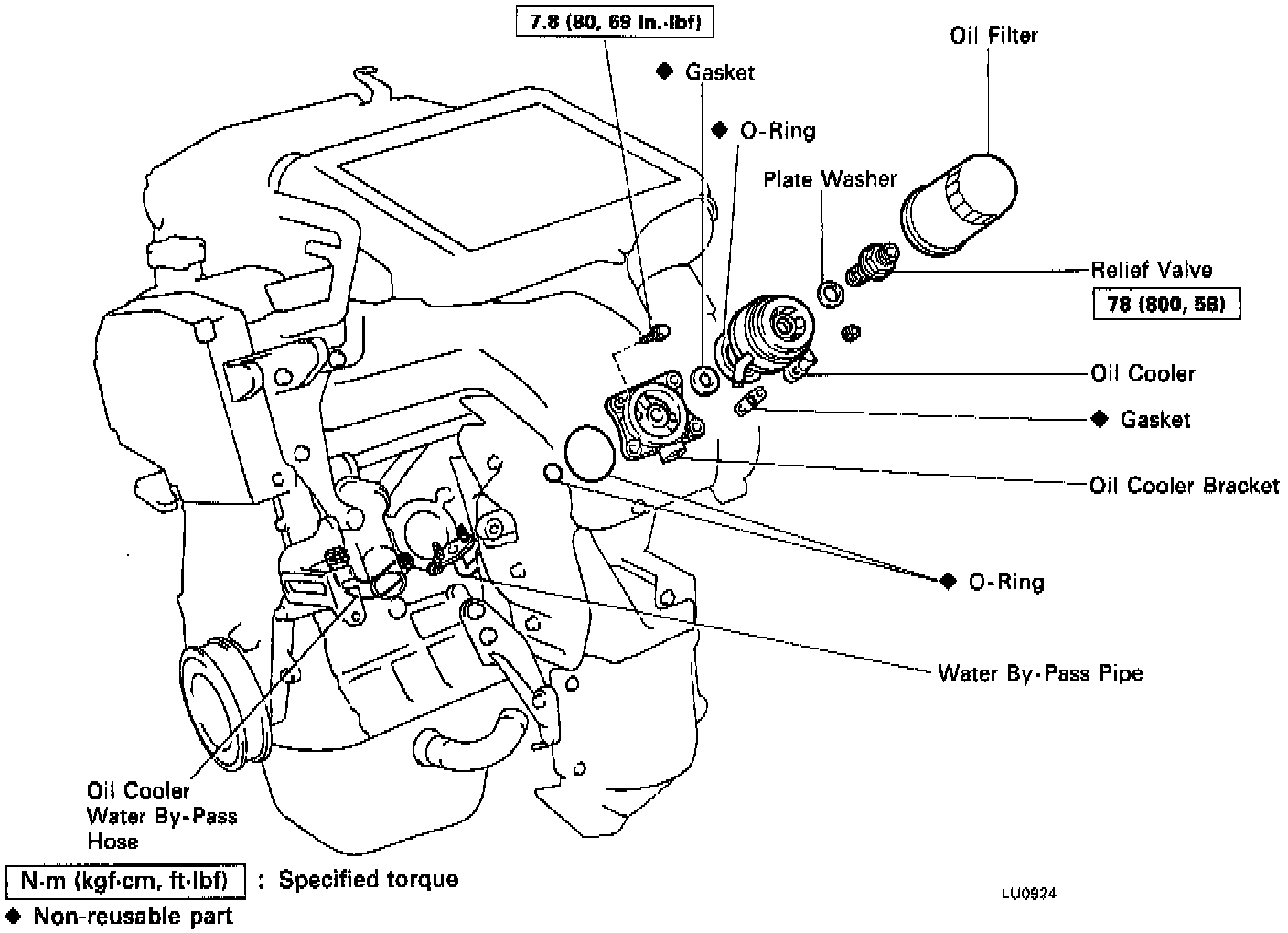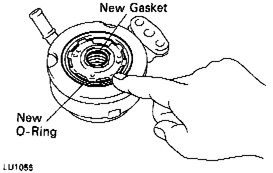 d. Temporarily install two new gaskets and the oil cooler with the plate washer, relief valve and two nuts.