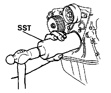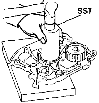 (b) Using SST and a hammer, tap in a new oil seal until its surface is flush with the oil pump case edge. SST 09226-10010