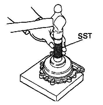 (d) Using SST and a hammer, tap in the oil seal until its surface is flush with the oil pump case edge. SST 09226-10010