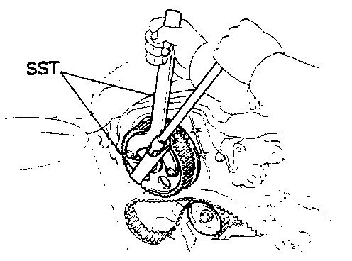 Using SST 09249-63010 and 09278-54012, remove the bolt, plate washer and timing pulley.