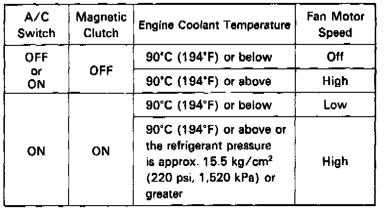 HINT: The fan motor operate at two speeds depending on the engine coolant temperature and the A/C switch.