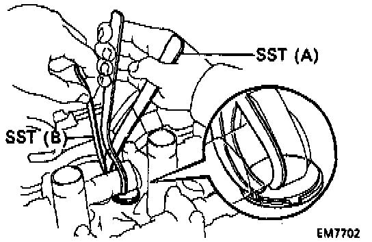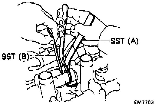 ^ Using SST (A), press down the valve lifter and remove SST (B).