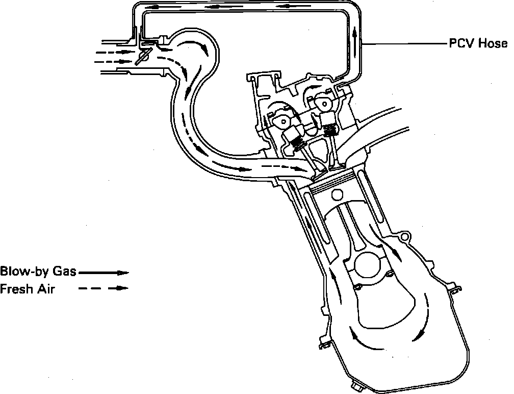 Fresh air from the air cleaner is supplied to the crankcase, mixed with blow-by gases and then passed through a metered orifice into the intake system. Once in the intake system the mixture is then added to the intake fuel/air charge and burned in the combustion process.
