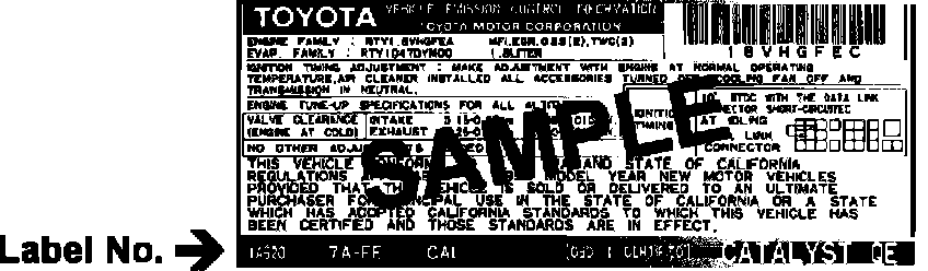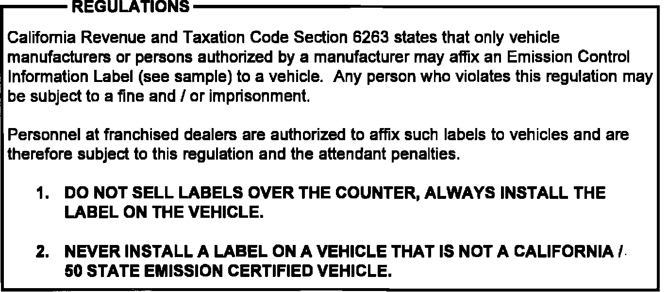 ^ For questions regarding Vehicle Emission Control Information Labels for California / 50 State Certified, call (310) 781-3254.