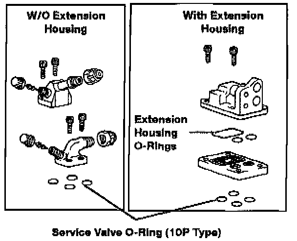c. Lubricate and install retrofit 0-rings into extension housing using specified PAG oil (see tables).
