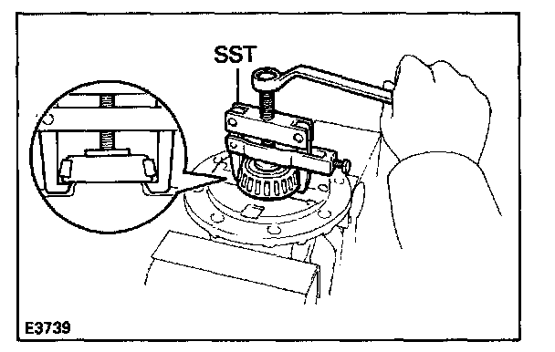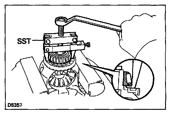 HINT: Apply the claw of the SST to the bearing inner race at the position where the differential case is indented.