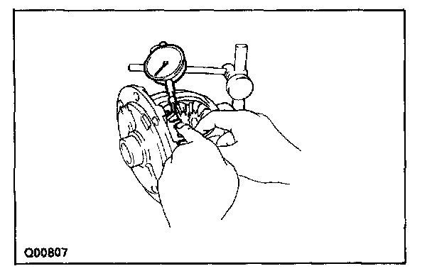 a. Using a dial indicator, measure the backlash of one side gear while holding one pinion toward the case.