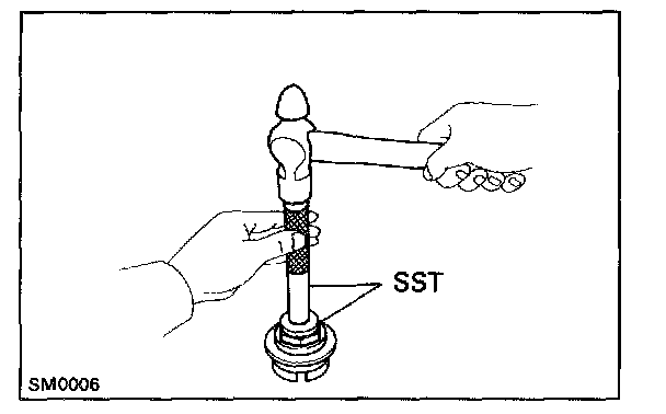 b. Using SST and a hammer, tap in a new oil seal until its surface is flush with the shaft cover surface.