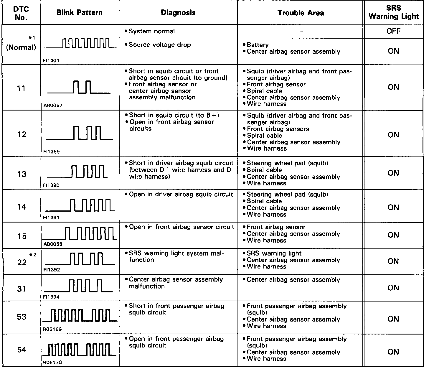 - When the SRS warning light remains lit up and the diagnostic trouble code is the normal code, this means a source voltage drop. This malfunction is not stored in memory by the center airbag sensor assembly and if the power source voltage returns to normal, after approx. 10 seconds the SRS warning light will automatically go out.