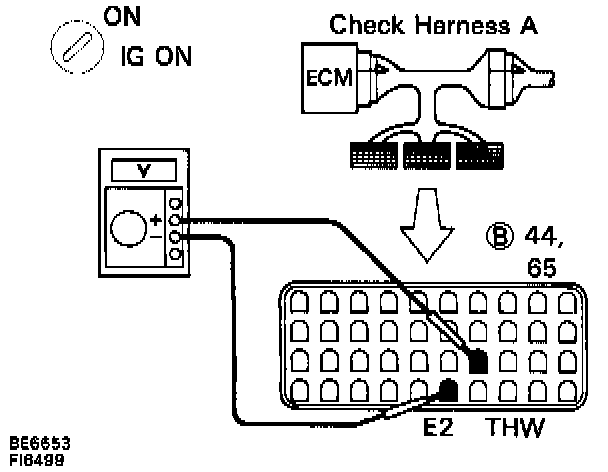- Measure voltage between terminals THW and E2 of ECM connector.