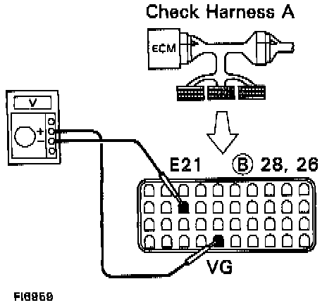 1. CHECK VOLTAGE BETWEEN TERMINALS VG AND E21 OF ENGINE CONTROL MODULE (ECM) CONNECTOR.