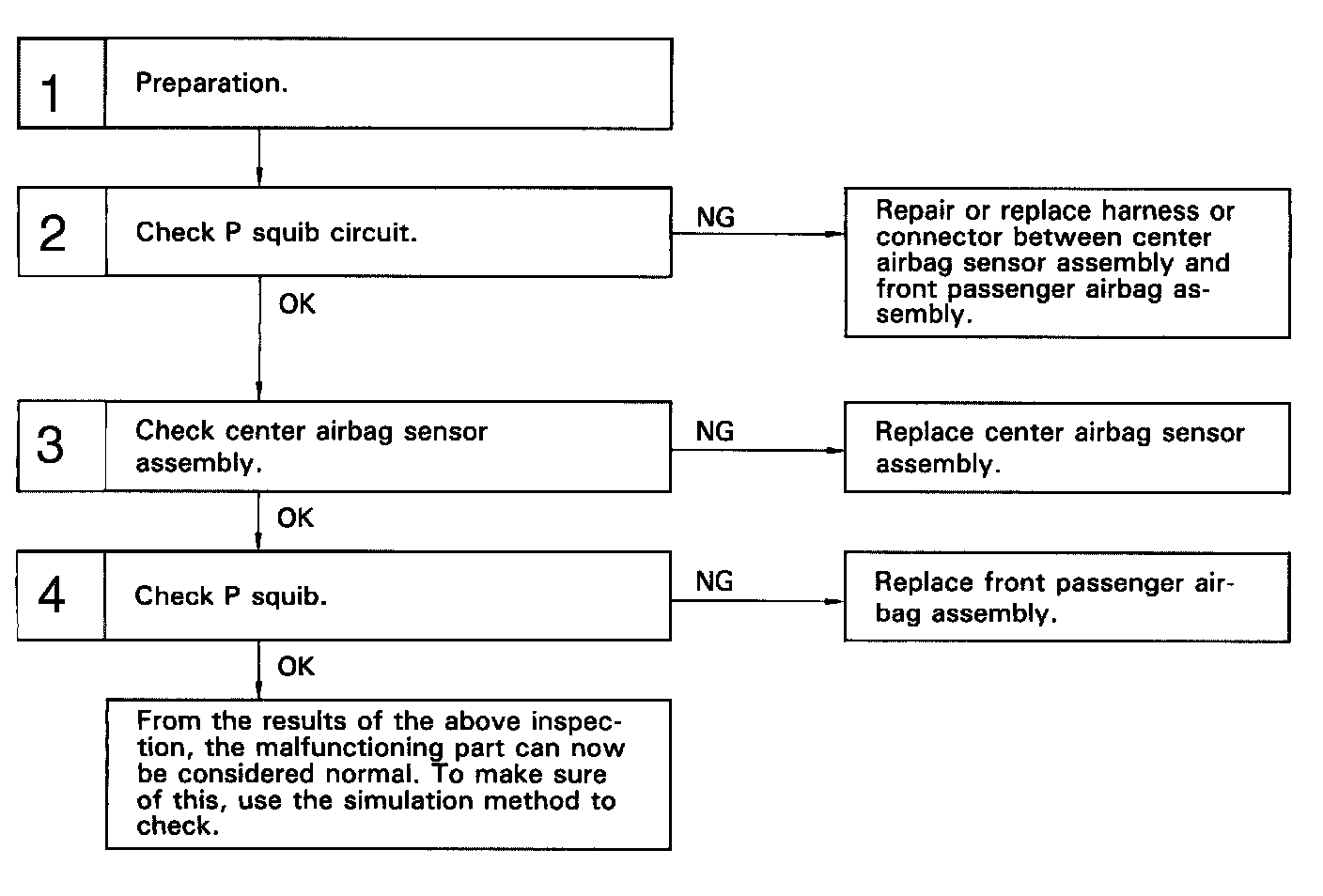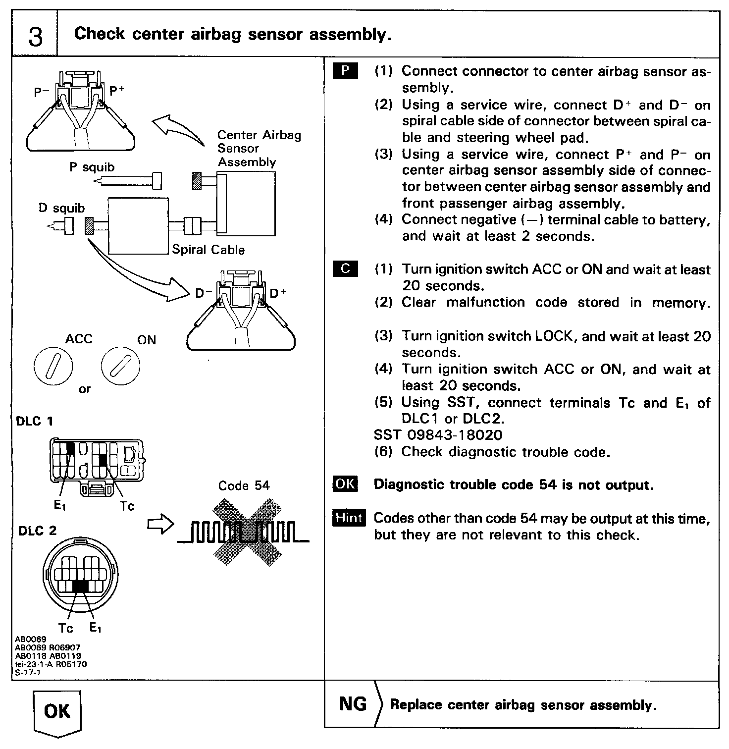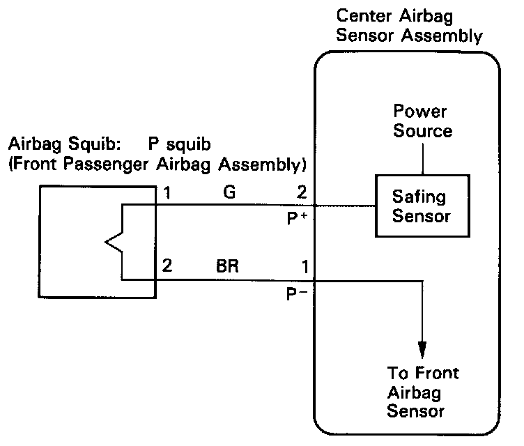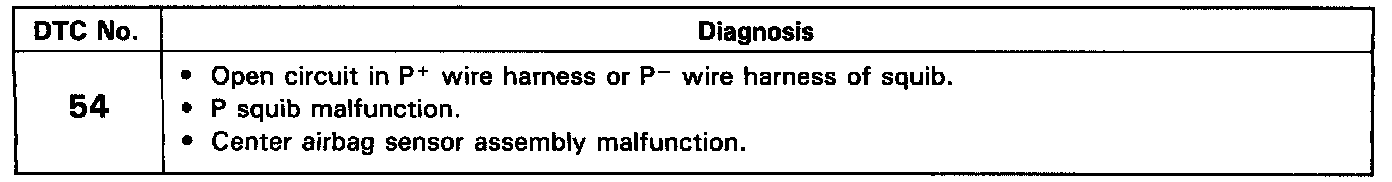 The P squib circuit consists of the center airbag sensor assembly and front passenger airbag assembly (squib). It causes the airbag to deploy when the airbag deployment conditions are satisfied. Diagnostic trouble code 54 is recorded when an open is detected in the P squib circuit.