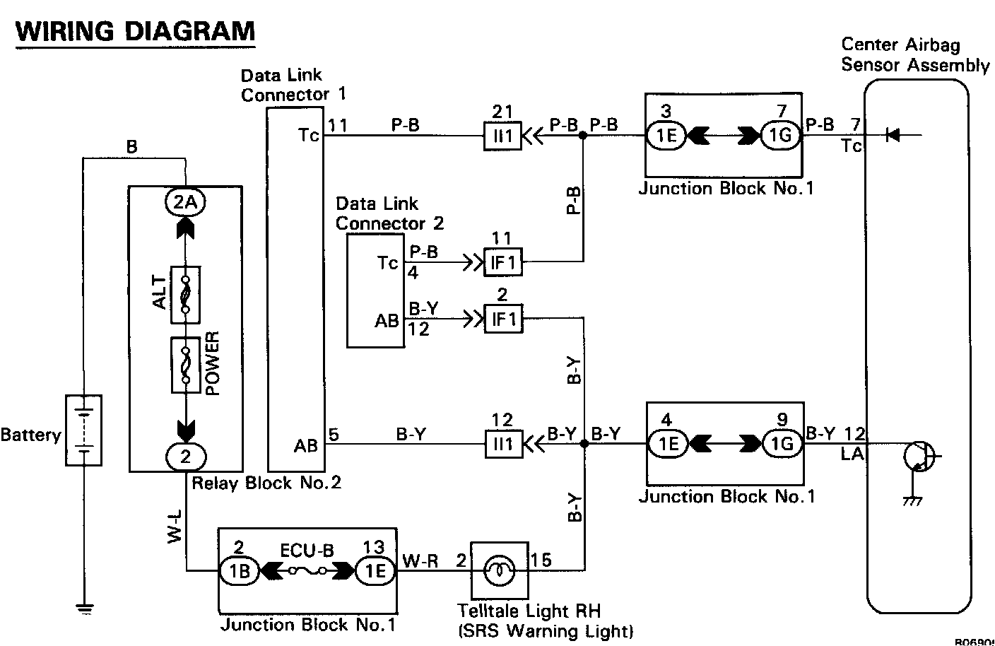 By connecting terminals Tc and E1 of the DLC1 or DLC2, the center airbag sensor assembly is set in the diagnostic trouble code output mode. The diagnostic trouble codes are displayed by the blinking of the SRS warning light.