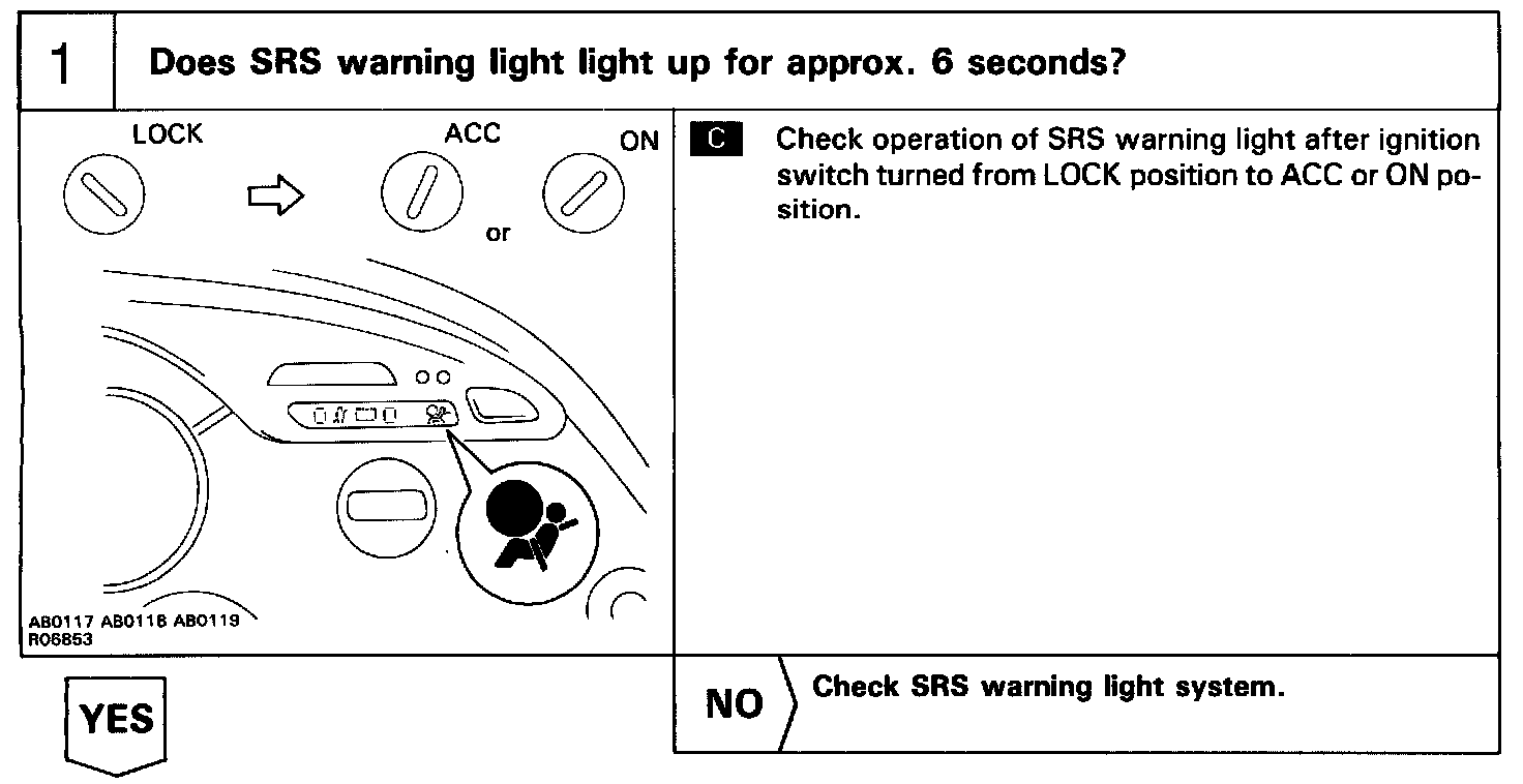 When the supplemental restraint system is normal, the SRS warning light lights up for approx. 6 seconds after the ignition switch is turned from LOCK position to ACC or ON position, and then turns off automatically.