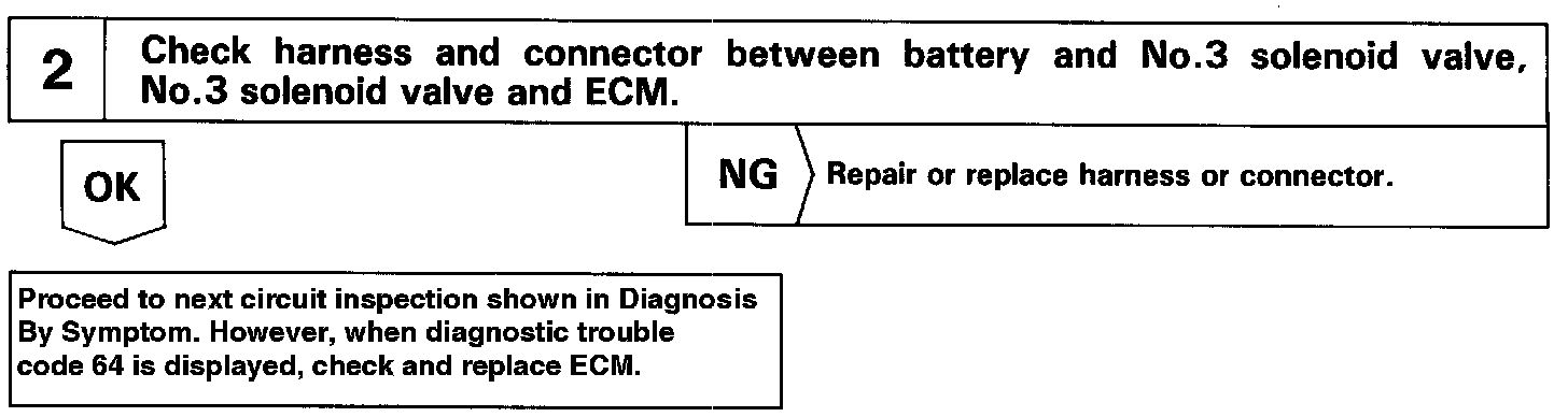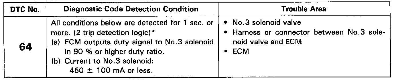The amount of current flow to the solenoid is controlled by the duty ratio of ECM output signal. The higher the duty ratio becomes, the higher the lock-up hydraulic pressure becomes during the lock-up operation. If the malfunction occurs in this circuit and diagnostic trouble code 64 is stored in memory, but the "O/D OFF" indicator light does not blink.