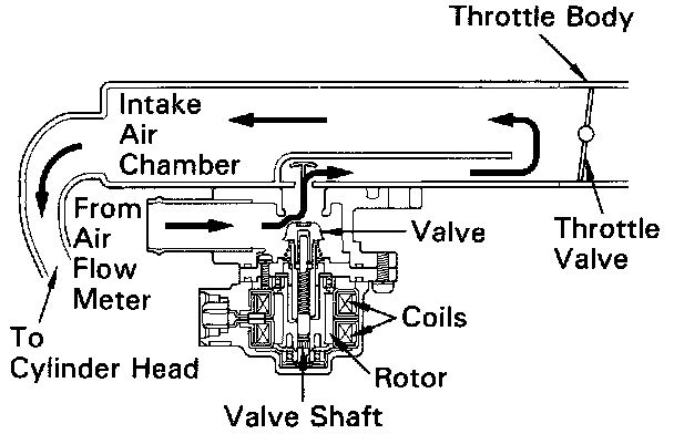 PURPOSE / OPERATIONThe IAC valve is situated on the intake air chamber Intake air bypassing the throttle valve is directed to the IAC valve through a passage.