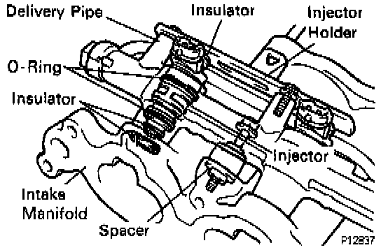 - Install the injector to the delivery pipe and intake manifold as shown in the illustration.