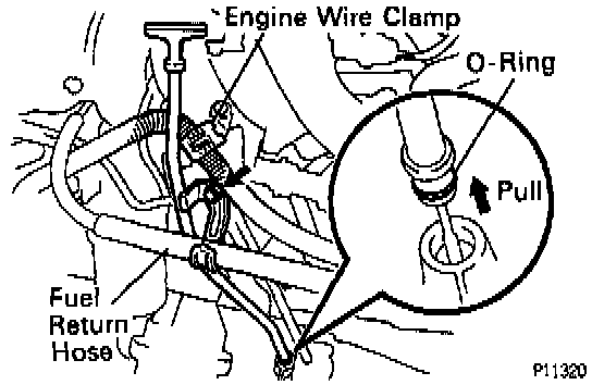 (a) Disconnect the fuel return hose from the clamp of the dipstick guide.