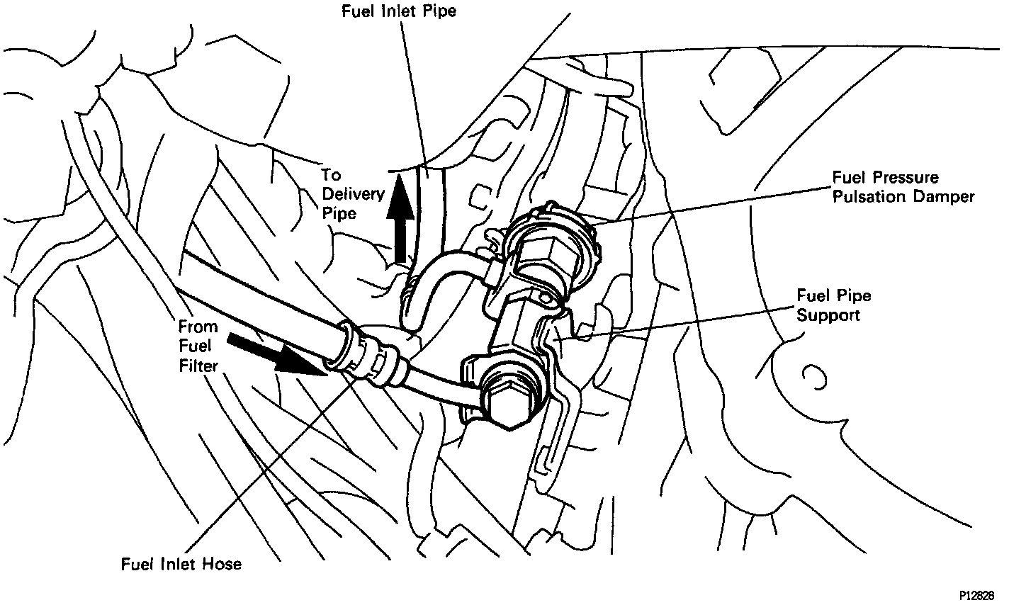 The fuel pressure pulsation damper decreases the fluctuations of fuel pressure that occur when an injector opens and closes.