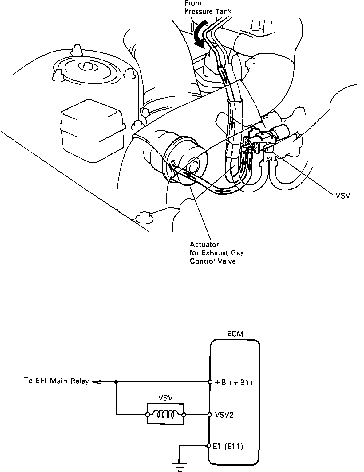 The VSV receives a constant voltage whenever the engine is running. As boost pressure increases the ECM completes the circuit which allows the actuator to open the exhaust gas control valve, causing turbo No. 2 to start spinning. This lets the turbo come up to operating speed. However, no boost is supplied from the unit until the intake air control valve opens as well.