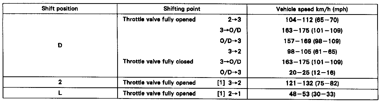 - Check that 1-2, 2-3 and 3-O/D up-shift takes place, at the shift point shown in the automatic shift schedule, below.