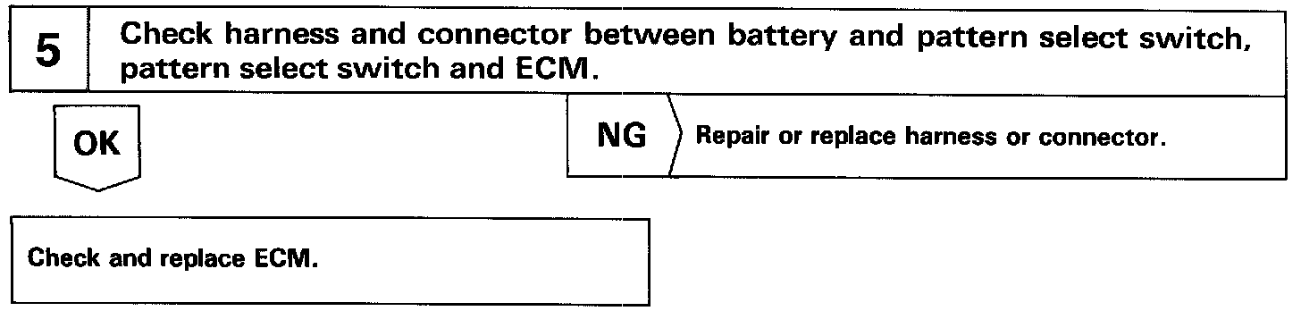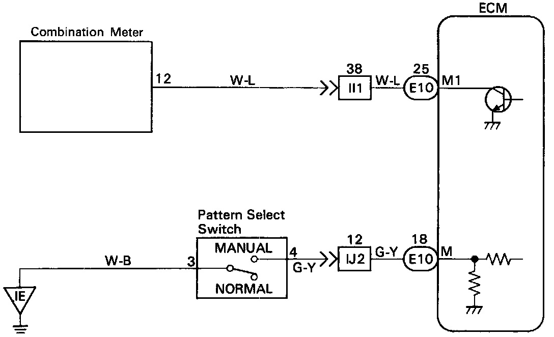 The ECM memory contains the shift programs for the NORMAL and MANUAL patterns, 2 position, L position and the lock-up patterns. Following the programs corresponding to the signals from the pattern select switch, the park/neutral position switch and other various sensors the ECM switches the solenoid valves ON and OFF, thereby controlling the transmission gear change and the lock-up clutch operation.