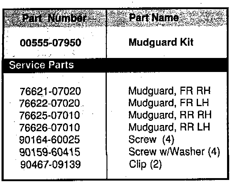 Front and rear mudguards are now available for installation on the 1995 Avalon. Thoroughly clean all attachment areas, inspect accessory kit contents bef9re installation, and follow the installation procedure below.