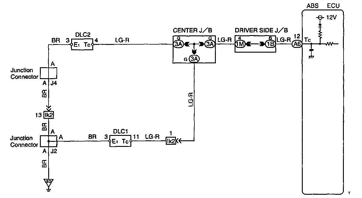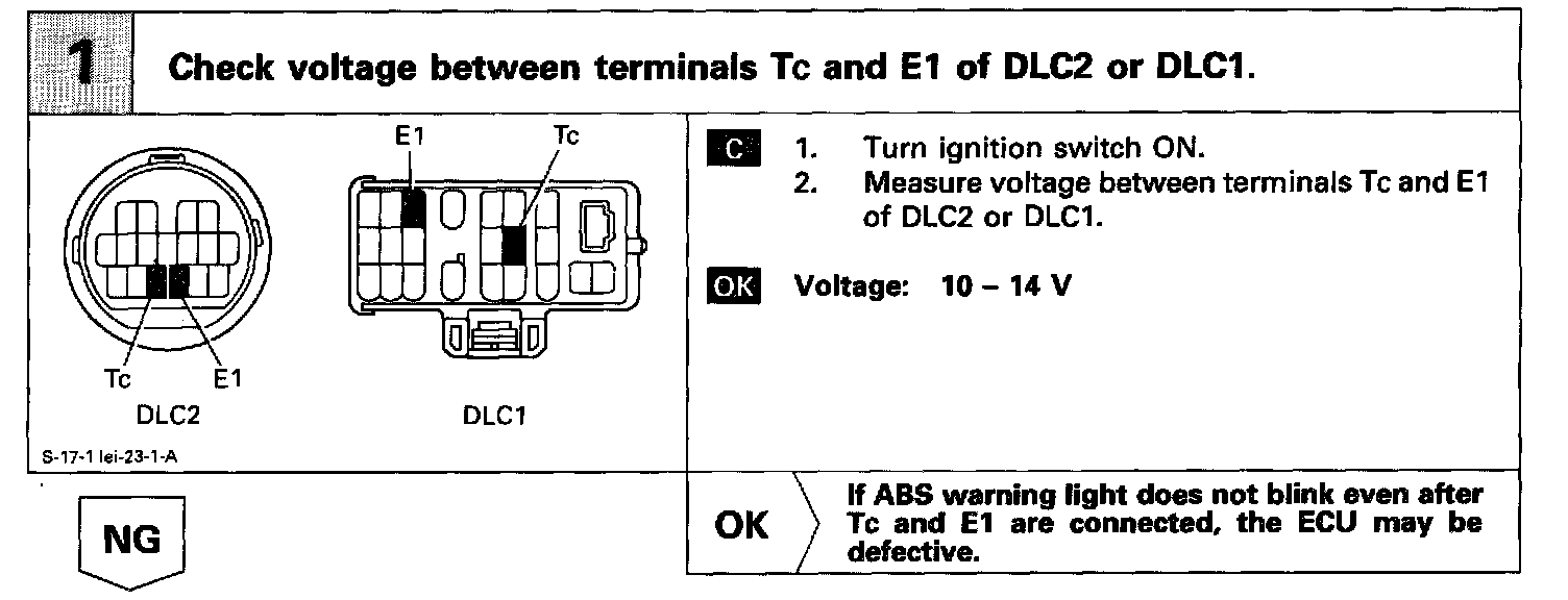 Connecting terminals Tc and E1 of the DLC1 or the DLC2 causes the ECU to display the diagnostic trouble code by flashing the ABS warning light.