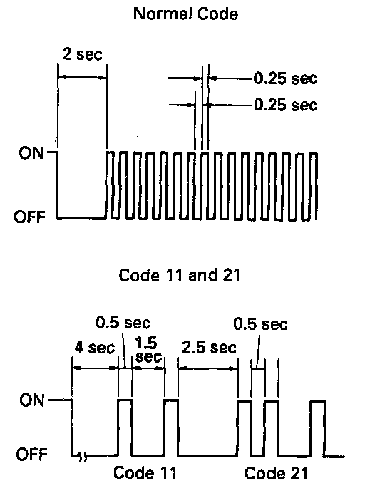 - As an example, the blinking patterns for normal code and codes 11 and 21 are shown above.