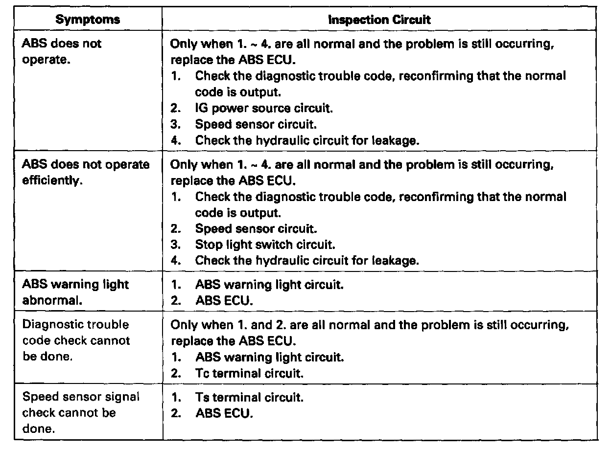 PROBLEM SYMPTOMS CHARTIf a normal code is displayed during the diagnostic trouble code check but the problem still occurs, check the circuits for each problem symptom in the order given in the table and proceed to the relevant troubleshooting.