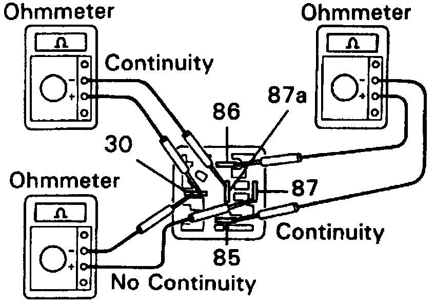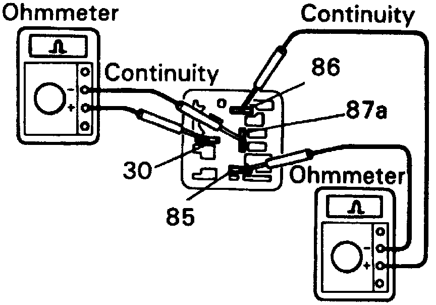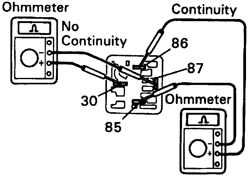 c. Apply battery voltage across terminals 85 and 86, then ensure no continuity exists between terminals 30 and 87.