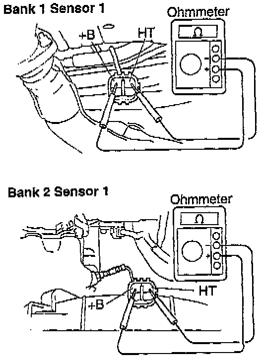1. INSPECT HEATER RESISTANCE OF HEATED OXYGEN SENSORS.(BANK 1 SENSOR 1, BANK 2 SENSOR 1)